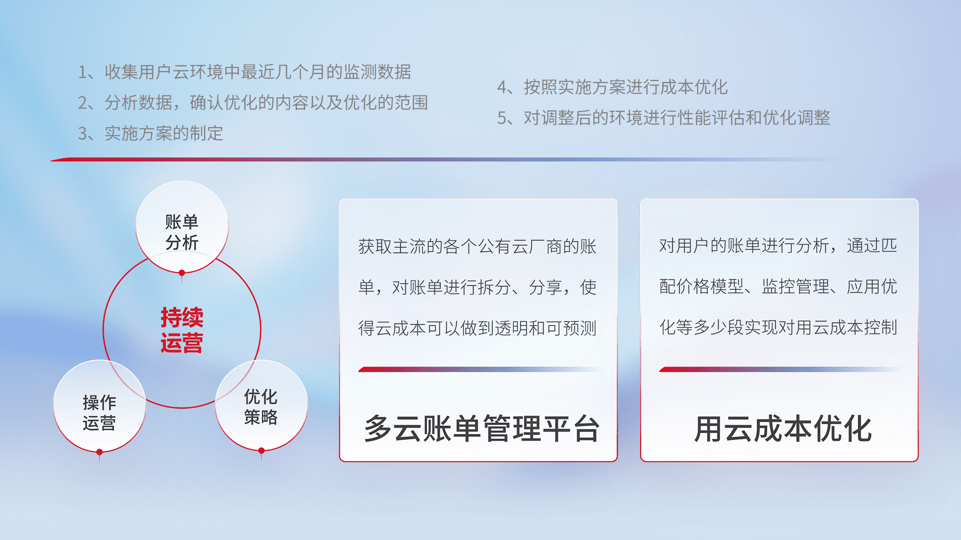 通过多云纳管,,,以统一的资源数据模型把客户的云资源进行抽象和封装,,,,进而实现对多云资源的统一操作,,保障云资源管理的可靠性、、、稳定性与可用性。。。量身定制化运维内容,,配置、、、、开发运维、、补丁管理、、、、备份、、、监控、、、、认证和访问管理、、、审计和日常巡检等,,,,保障在用云过程中的可靠度,,稳定度以及高可用率。。。